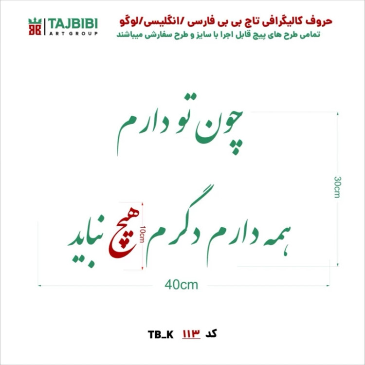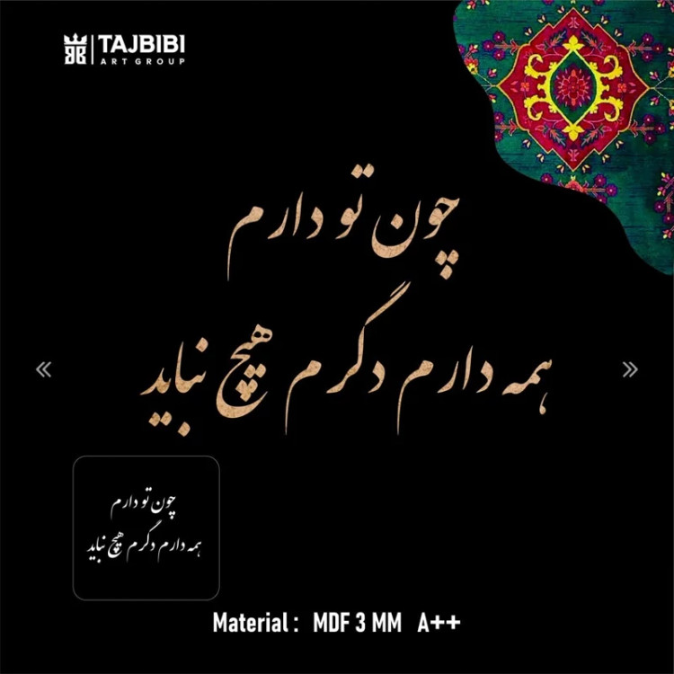این محصول شامل چهار قطعه حروفبری چوبی است. طراحی این حروف بهصورت کالگرافی با ترکیب هنر اصیل ایرانی و مدرن انجام شده و روی MDF با کیفیت 3 میل A++ برش لیزری خورده است. ویژگیها: تعداد در هر پک: 4 قطعه از شعر کامل کاربرد: تابلوسازی، دکور دیواری، هدایای هنری، هنرهای دستی بدون رنگ و آماده برای خلق اثر هنری توسط شما این محصول هم برای هنرمندان حرفهای و هم برای علاقهمندان به هنرهای دستی خانگی بسیار کاربردی است. با استفاده از آن میتوانید تابلوهایی خاص و منحصربهفرد بسازید که حال و هوای شعر و هنر ایرانی را به فضا ببخشد. ابعاد شعر و حروف داخل عکس ها موجود میباشد . برای سفارش طرح دلخواه و یا سایز های دلخواه پیام بدین تا راهنمایی تون کنم.